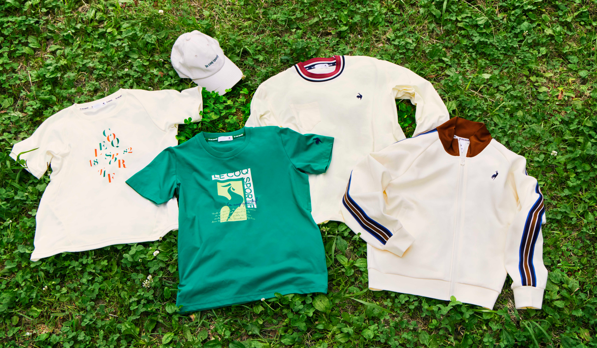 左からロゴTシャツ ¥4,950、Tシャツ(緑)¥4,620<7月下旬発売予定>、長袖シャツ ¥5,940<8月上旬発売予定>、ジャケット ¥10,890 <8月上旬発売予定>、キャップ ¥3,850(le coq sportif/デサントジャパンお客様相談室)