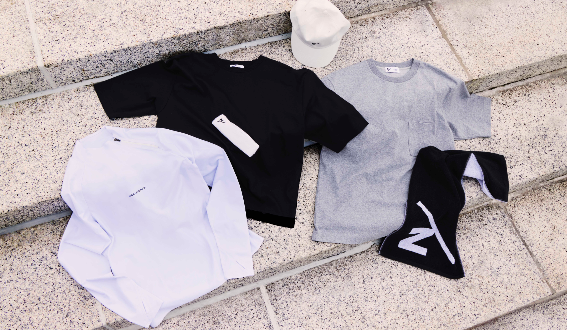 左からラッシュガード ¥15,400、Tシャツ(黒)¥10,450、Tシャツ(グレー)¥11,330、フェイスタオル ¥3,300、キャップ¥6,050、ヘッドバンド ¥4,180(すべてNEUTRALWORKS./ゴールドウイン カスタマーサービスセンター)